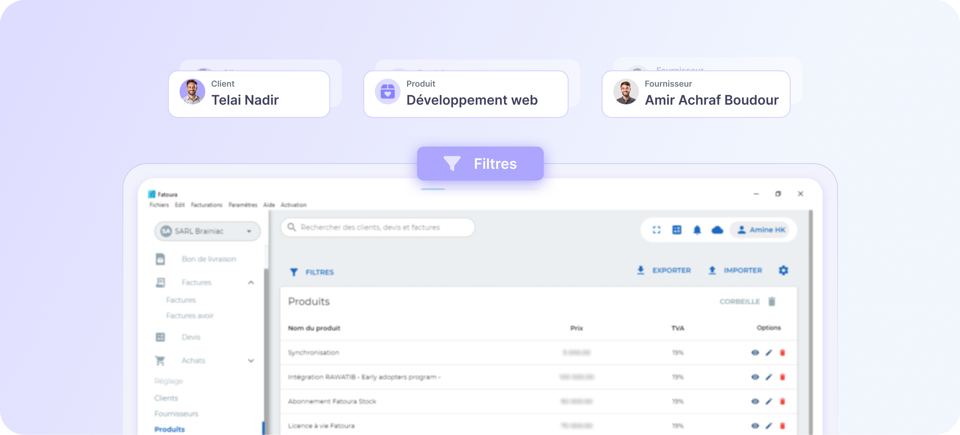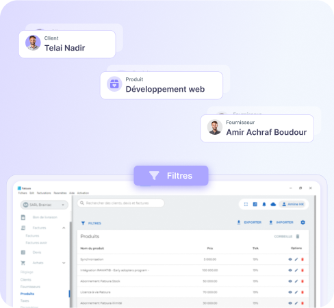 Accédez à un répertoire clients, produits et services bien structuré. Les filtres de recherche facilitent la localisation rapide des données clients, optimisant ainsi votre gestion