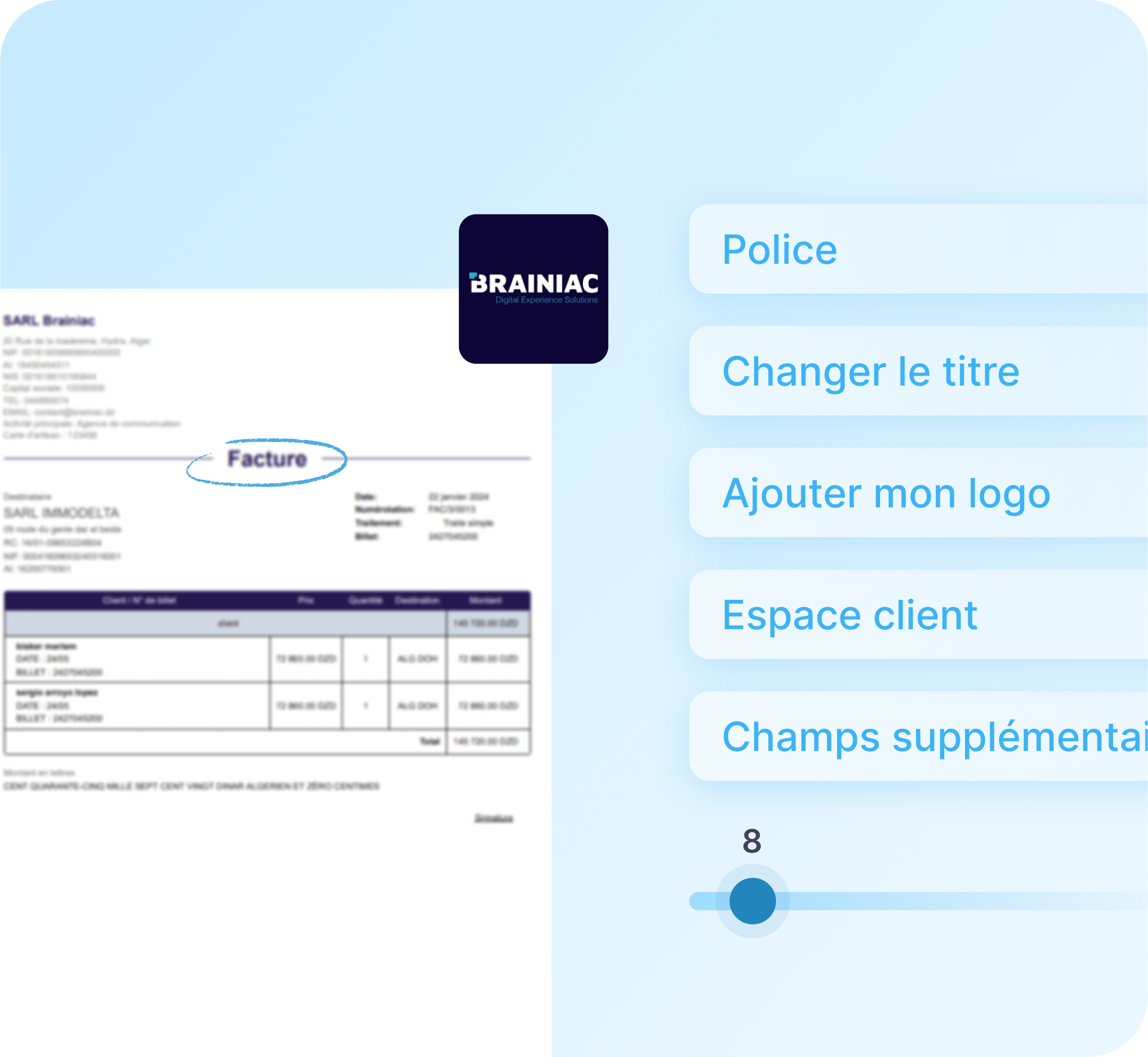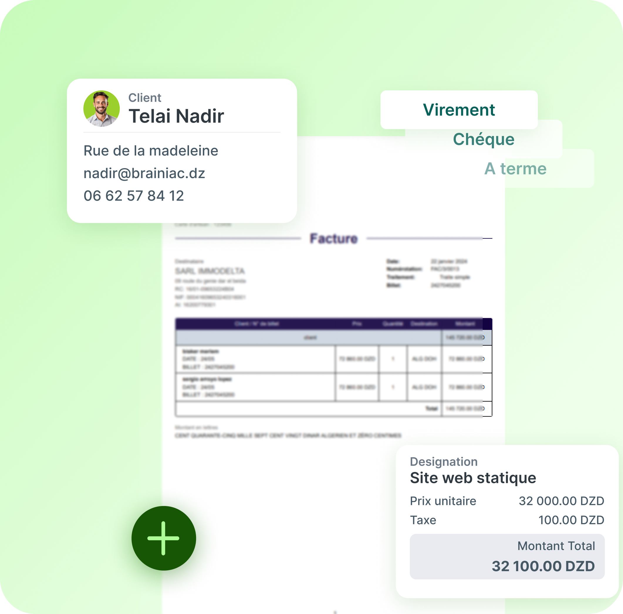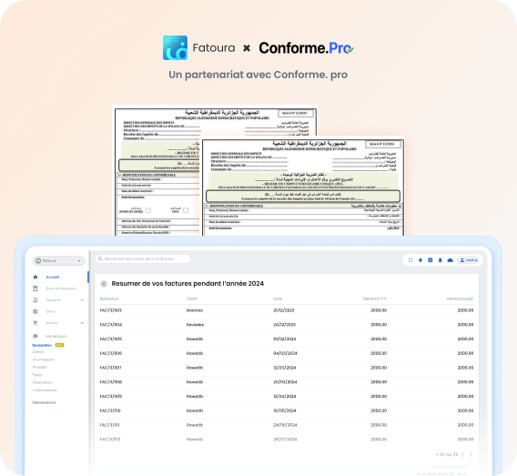 En tant qu'entrepreneur, la facturation conforme aux normes législatives algériennes est essentielle. Fatoura simplifie ce processus en seulement trois clics. Nos factures respectent toutes les exigences obligatoires, comprenant les détails du client, les termes de paiement, les services ou produits fournis, ainsi que les informations fiscales conformes à la législation en vigueur en Algérie