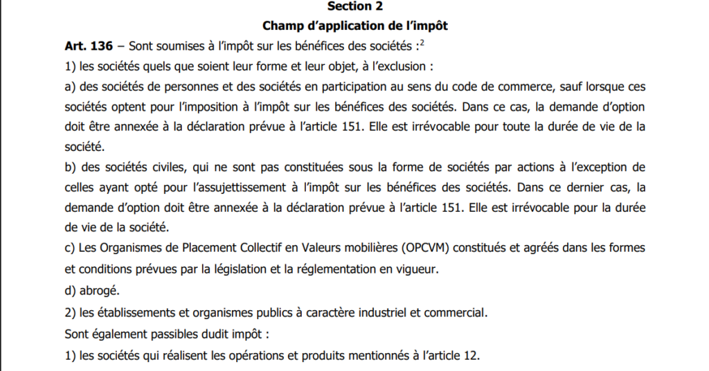 - Les sociétés pouvant opter pour l’IBS : Les sociétés de personnes comme les SNC (Sociétés en Nom Collectif) et les SCS (Sociétés en Commandite Simple) sont, par défaut, imposées au nom de chaque associé sur leur part de bénéfices (IRG). Cependant, la loi leur offre la possibilité d’opter volontairement pour l’IBS. Attention : ce choix est irrévocable.