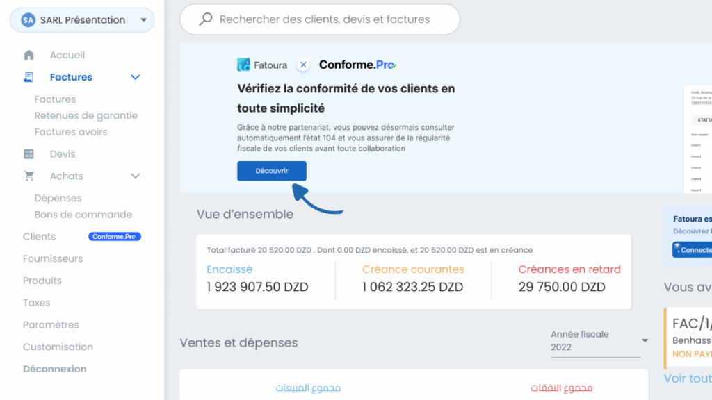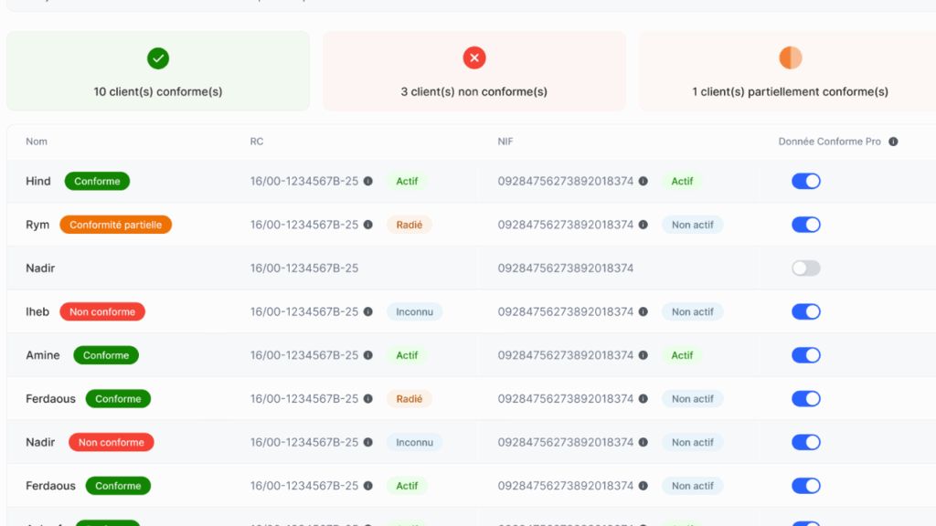 Fatoura continue d’évoluer pour simplifier davantage vos processus de gestion. Dans la continuité de notre réflexion sur l’importance de transmettre des données clients fiables lors de la déclaration de l’État 104 (lire ici), cette nouvelle mise à jour introduit une fonctionnalité innovante : la vérification automatique de la conformité des clients directement depuis votre espace Fatoura, en partenariat avec Conforme Pro.