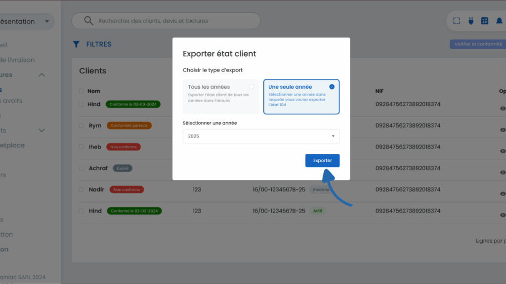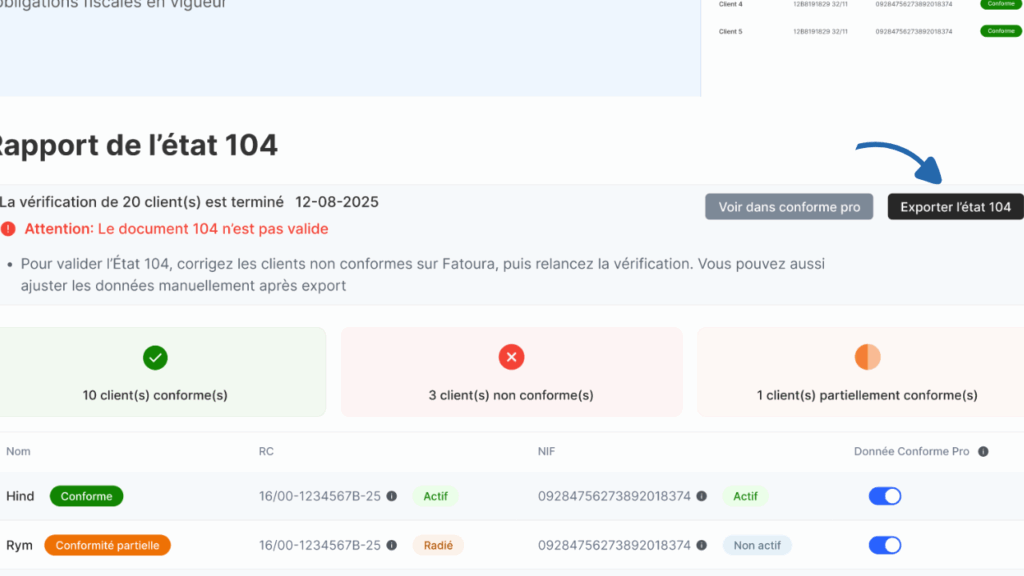 Pour les clients non ou partiellement conformes, il vous suffira de revenir sur Fatoura et de mettre à jour les informations nécessaires. Une fois ces corrections effectuées, vous pourrez alors exporter l’État 104 en toute conformité.