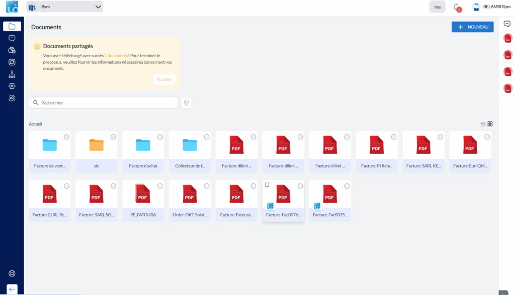Partage et discussions centralisées : L’utilisateur peut consulter et partager ses documents avec son comptable ou ses partenaires financiers et même entamer des discussions avec eux.